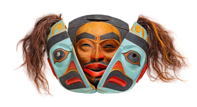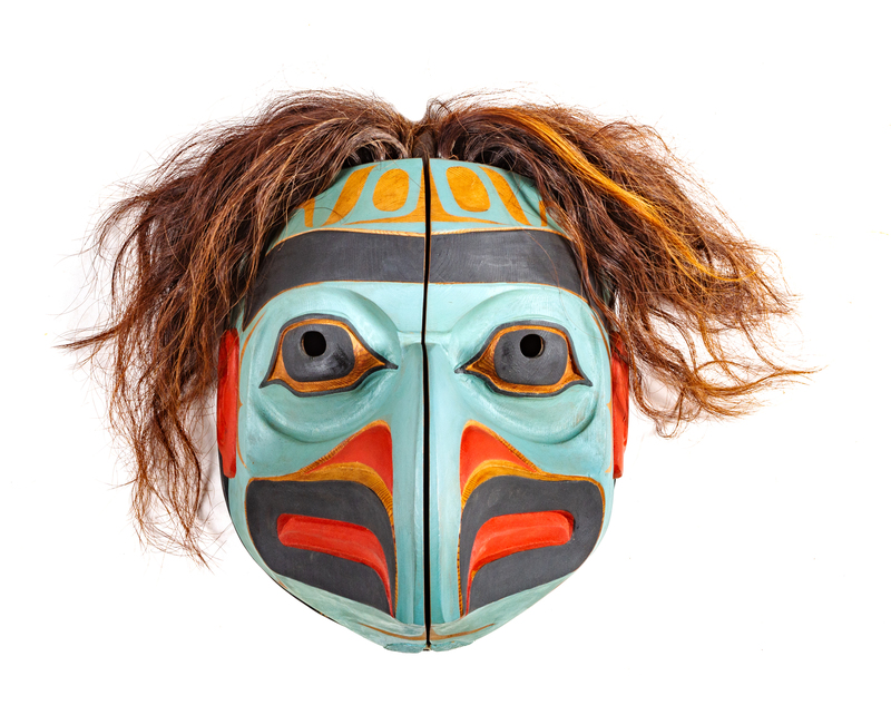 polychrome carved wood mask, opens to reveal interior mask, signed Lelooska (verso)