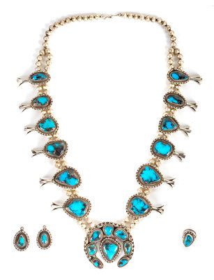 Southwestern Silver and Bisbee Turquoise Squash Blossom Demi Parure