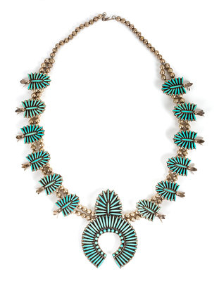 needlepont squash blossom necklace composed of twelve blossoms with matching naja, stamped J.L. Peynetsa
