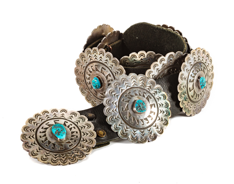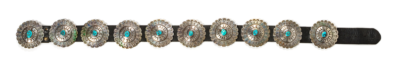 with ten scalloped round stamped design conchos with center turquoise nugget