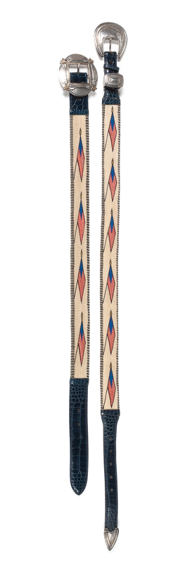 with US flag motif, his buckle is by Mona Van Riper and stamped 925 14kt gold and her Navajo-style buckle is stamped 925 with artist hallmark