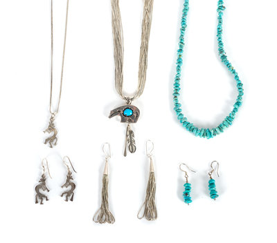 one a liquid silver necklace with bear pendant and matching liquid silver earrings, the second a turquoise bead necklace with matching earrings and the thrid a Kokopelli pendant with matching earrings
