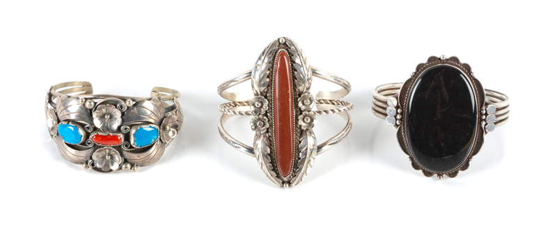 Three Southwestern Cuff Bracelets Length of first 5 x opening 1 1/8 x width 2 3/4 inches