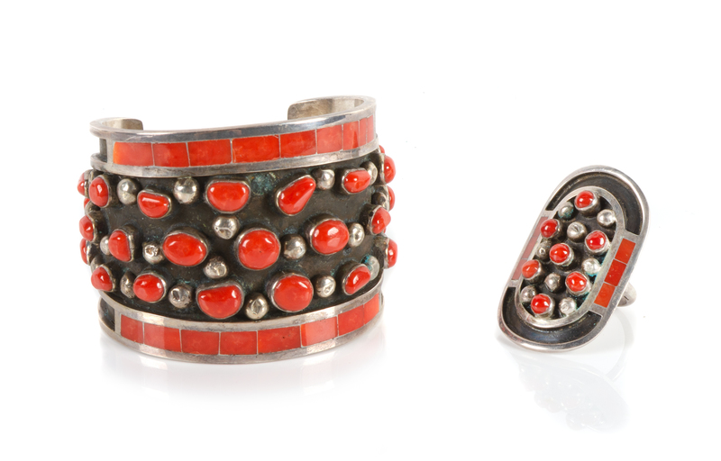 silver and coral bracelet and ring, each signed Jobeth Mayes Zuni Maize
