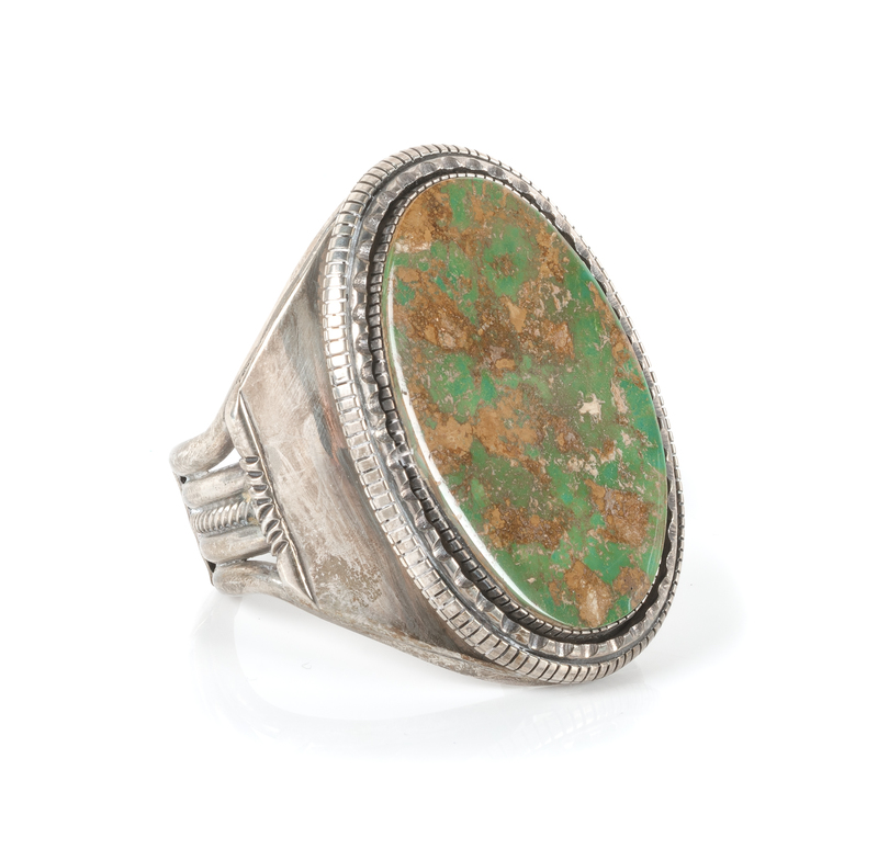 having a single large green turquoise stone, stamped Navajo M Sterling