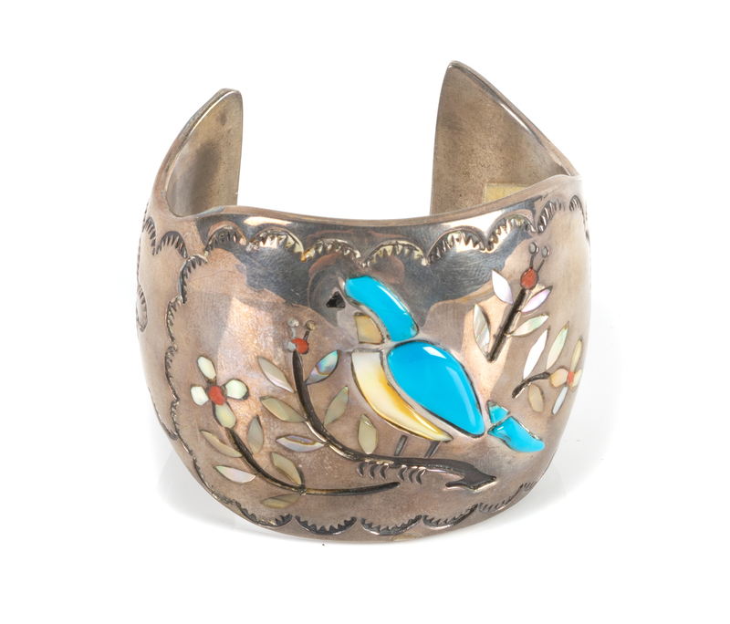 silver and multi-stone pictorial cuff, the inlay depcting a bird on flowering branches, stamped H. Spencer IHMSS