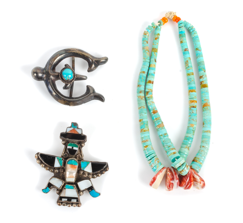 one a naja form with single turquoise stone and the other a Zuni Knifewing kachina, together with turquoise and coral jocla