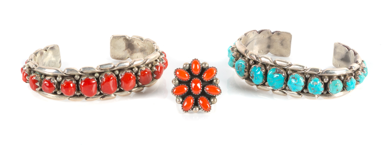 two bracelets, one a silver and coral bracelet, the other a silver and turquoise bracelet, each stamped Avelina Q. Zuni, together with a coordinating silver and coral ring