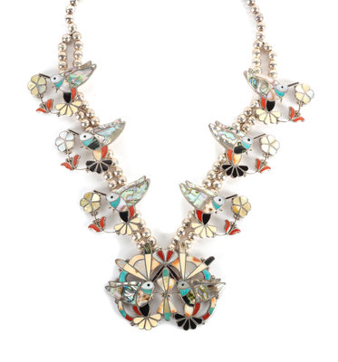 Zuni Silver and Multi-Stone Mosaic Inlay Hummingbird Necklace Length 26 inches