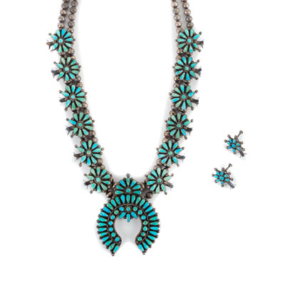 Southwestern Silver and Turquoise Petit Point Squash Blossom Necklace and Earrings Length 23 inches
