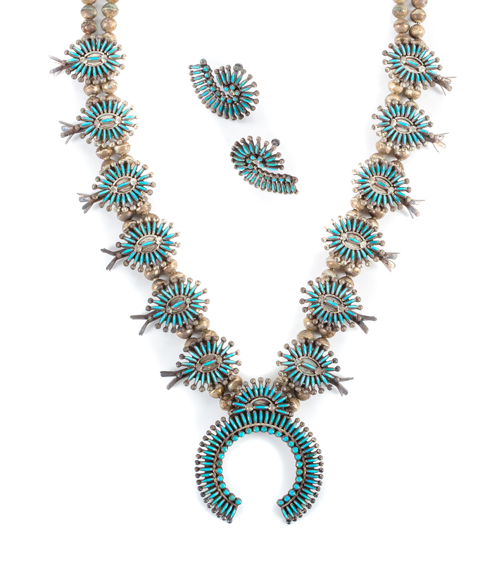 Zuni Silver and Turquoise Needlepoint Squash Blossom Necklace and Earrings Length 24 inches