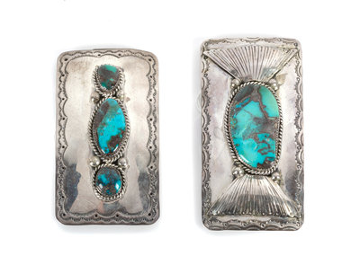 two silver and turquoise belt buckles, one with three turquoise stones, the other with a single stone, each stamped Jerry Francisco Navajo