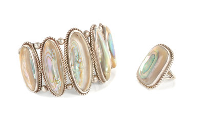 Southwestern Silver and Mother-of-Pearl Cuff Bracelet and Ring Length 5 1/2 x opening 2 3/4 x width 2 inches