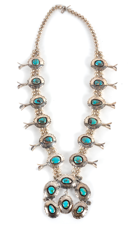 Southwestern Silver and Turquoise Squash Blossom Necklace Length 27 inches