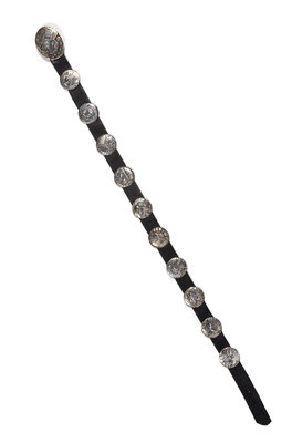 with ten round conchos, each depiting a Kachina figure, the matching oval buckle having coral and turquoise inlay, stamped LEE, Sterling, 2/75