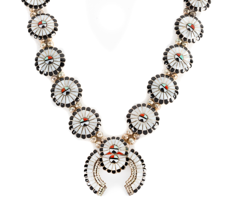 Zuni Sun Face Kachina Squash Blossom Necklace Length 30 inches; naja 2 1/4 x 2 1/4 inches