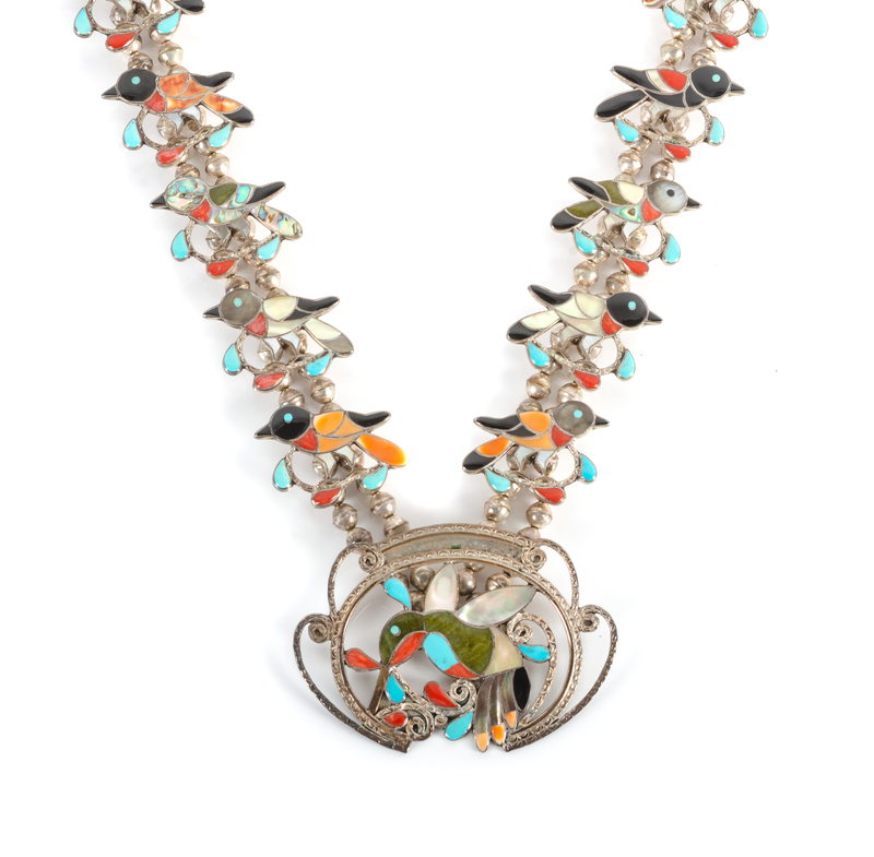 Zuni Silver and Multi-Stone Mosaic Inlay Hummingbird Necklace Length 28 inches