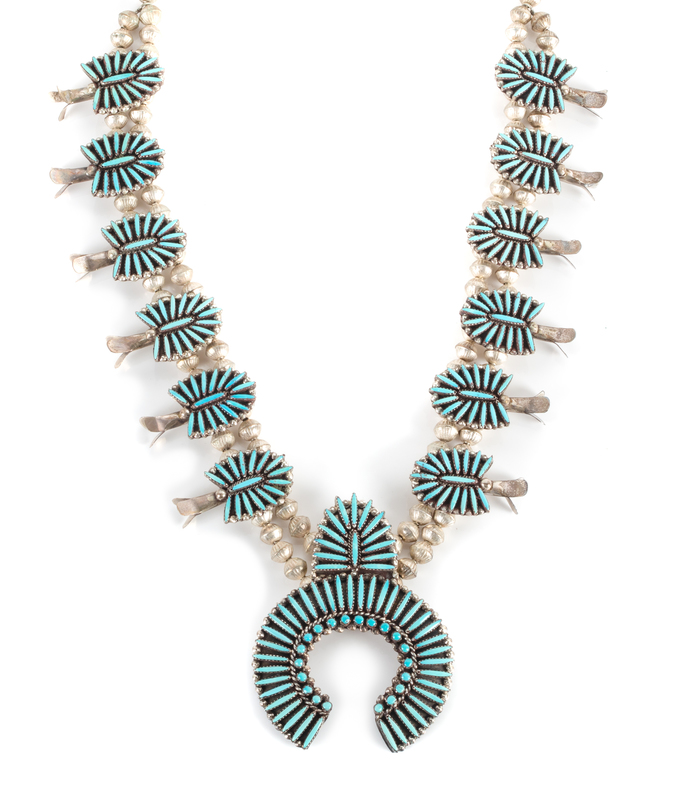 silver and turquoise needlepoint squash blossom necklace, stamped J.L. Peynetsa