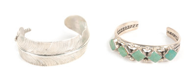 featuring five square turquoise stones, stamped illegibly, together with a Navajo silver bracelet stamped Ben Begaye Sterling