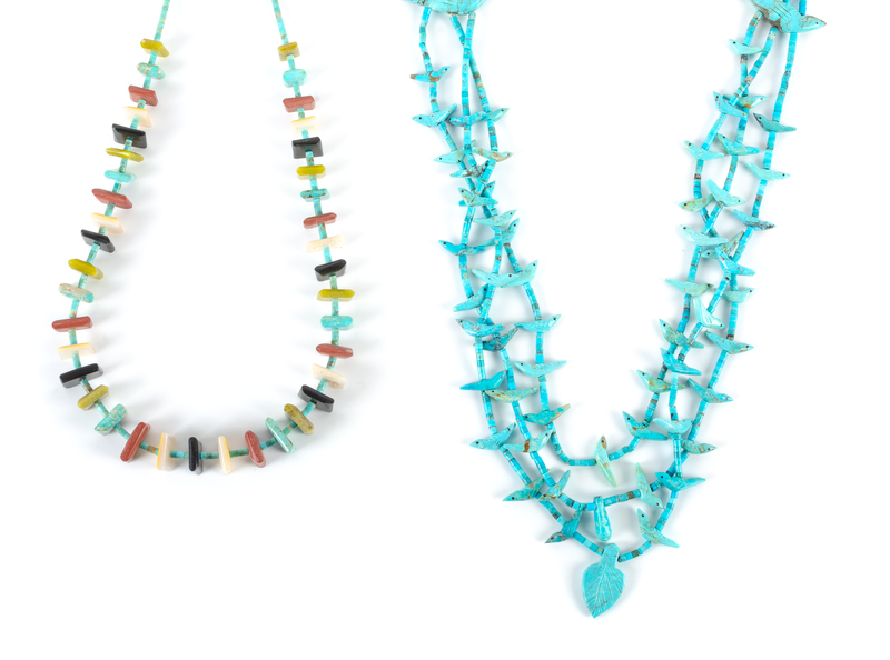one a three strand turquoise bird fetish necklace and the second a single strand with mutli-stone square beads.
