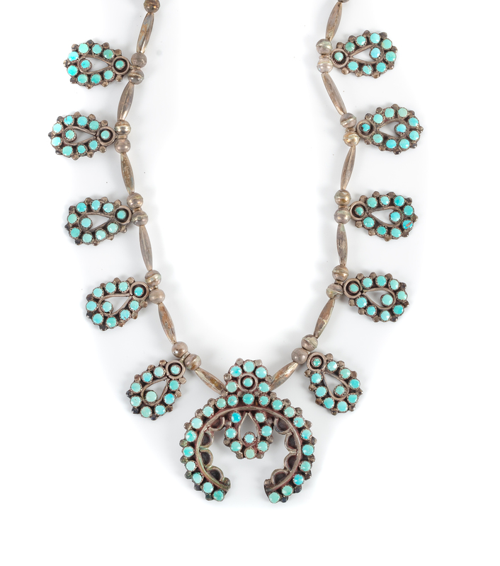 Southwestern Silver and Turquoise Squash Blossom Necklace Length 28 inches