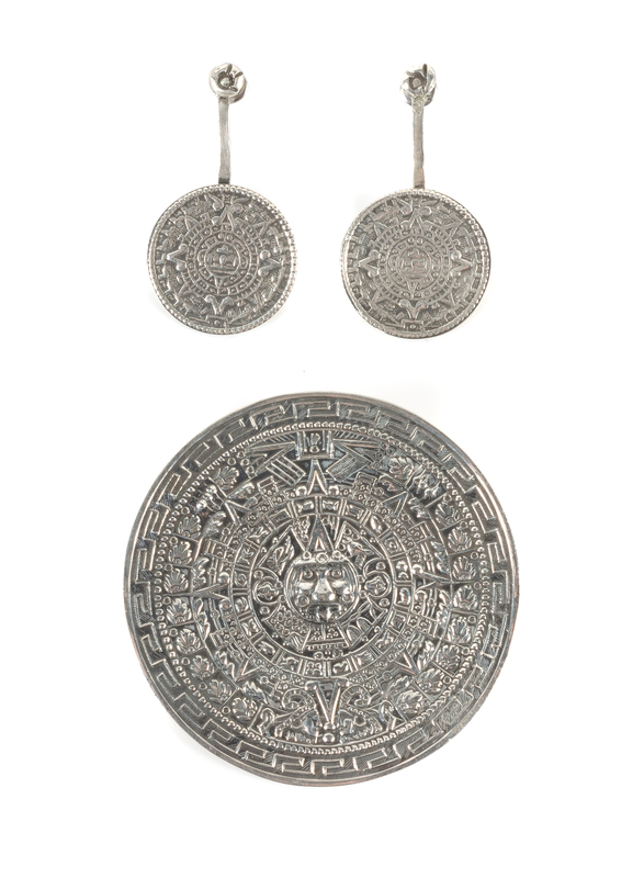 Mexican Silver Brooch and Earrings Diameter 2 1/8 inches