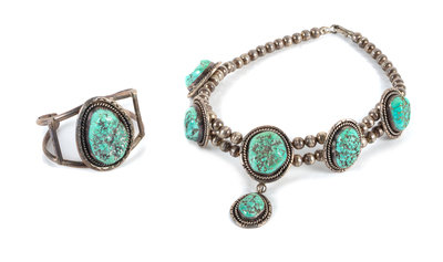 having six turquoise nugget stones, together with a matching silver and turquoise bracelet