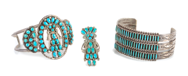 one with turquoise needle point design, the second with turquoise petit point depicting a Kachina figure stamped AP, together with a matching ring stamped AP