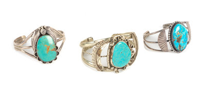 Three Southwestern Silver and Turquoise Bracelets Length of largest 6 x opening 7/8 x width 1 3/4 inches