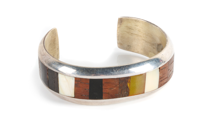 Southwestern Silver and Inlaid Wood Bracelet Length 5 1/4 x opening 1 1/4 x width 5 /8 inches