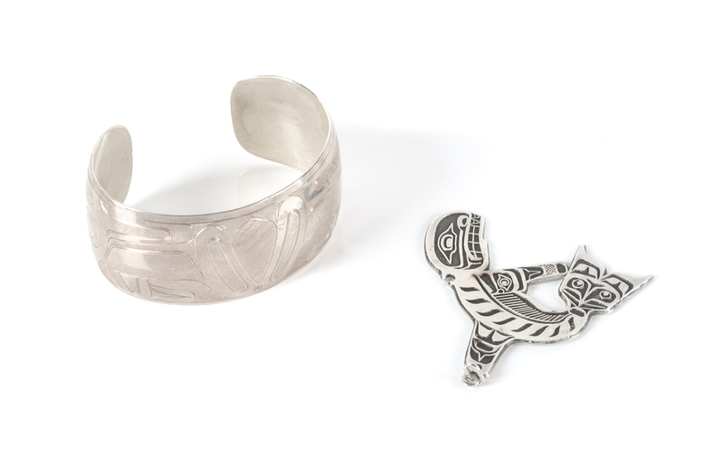 Two Northwest Coast Style Jewelry Articles Length of bracelet 5 7/8 x opening 1 1/8 x width 1 1/4 inches