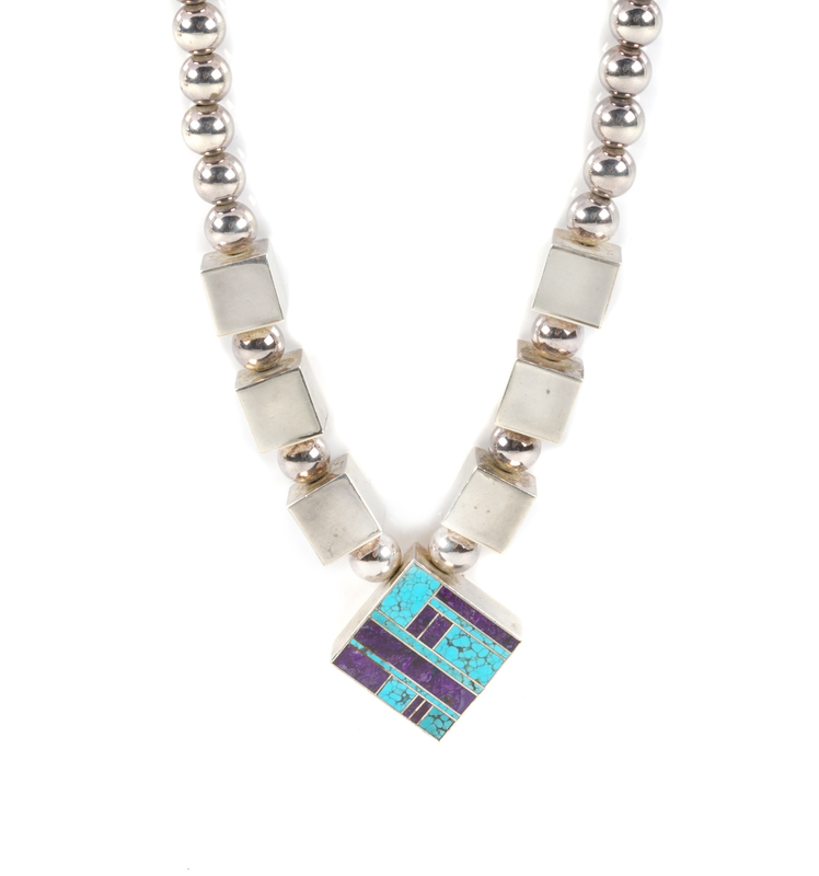 silver and turquoise inlay bead necklace, stamped with artist's hallmark and sterling