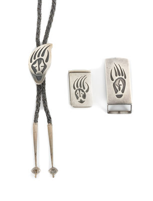 Hopi Silver Overlay Bolo, Belt Buckle and Money Clip Height of bolo 2 inches