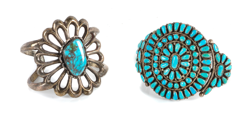 Two Silver and Turquoise Cuff Bracelets Length of largest 6 x opening 1 3/8 x width 2 1/2 inches.