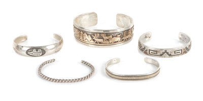 Five Southwestern Silver Bracelets Length of largest 7 1/4 x opening 1 x width 7/8 inches