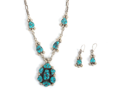 Southwestern Silver and Turquoise Nugget Necklace and Earrings Length 20 inches