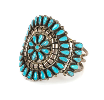 Southwestern Silver and Turquoise Cluster Bracelet Length 6 1/4 x opening 1 1/8 x width 2 5/8 inches