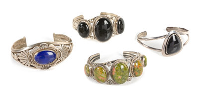 Four Southwestern Cuff Bracelets Length of largest 5 3/4 x opening 1 1/4 x width 1 1/4 inches