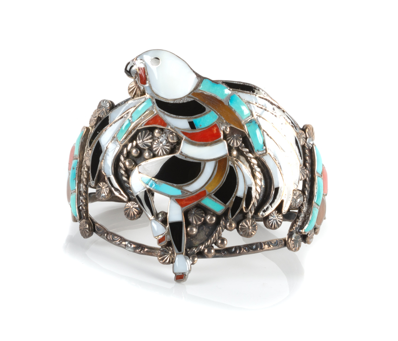 Zuni Silver and Mosaic Inlay Eagle Dancer Cuff Bracelet Length 5 1/4 x opening 1 x width 2 1/2 inches