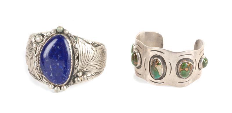 Two Southwestern Cuff Bracelets Length of largest 6 1/4 x opening 1 x width 2 1/4 inches
