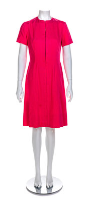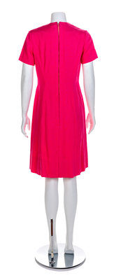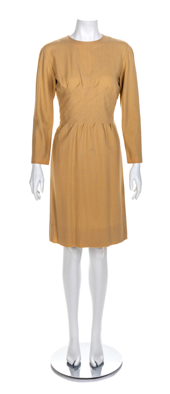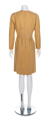 The tan wool dress has a crew neckline with long sleeves and diagonal seaming through the waist. Dress is lined in a tan silk and closes down the center back with a zip. Label: Pauline TrigereThe pink dress has a thin v-neckline, short sleeves, a-line skirt and a center back zipper closure. Label: Pauline Trigere