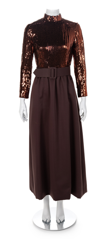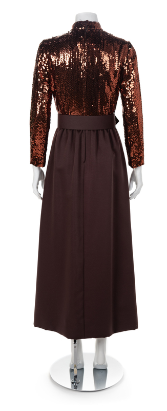Long column dress with a bodice of brown sequins and the skirt of brown satin. The bodice has a stand collar and long sleeves and the straight skirt is gathered into the waistline. The dress closes down the center back with a zip. The belt is covered in brown satin with a rectangular buckle. Label: Traina / New York