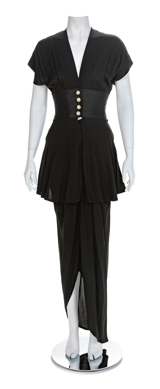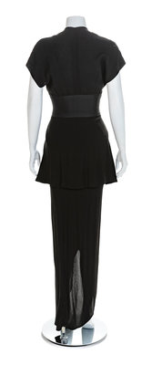 Black crepe bodice, peplum and skirt with waistband of ribbed silk. Sleeveless bodice has a plunging v-neckline and is gathered into the waistband. The long skirt has multiple tucks into the waistband and an asymmetrical hem. A hip peplum extends from the waistband. The dress closes down the center front with four clear and gold pain buttons Labeled: Traina-Norell / New York