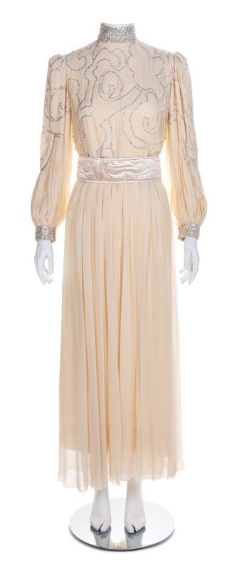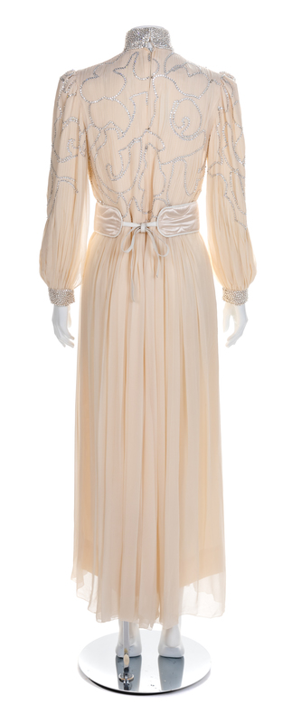 embellished with clear faceted beads at high collar and cuffs. Bodice and sleeves further embellished with clear faceted beads in an abstract pattern. Dress is underlined with matching chiffon and closes at center back with a zipper and hook and eyes at collar. Matching silk satin slip with a side zip closure. Wide self-tie belt of top-stitched satin and white leather. Label: Galanos