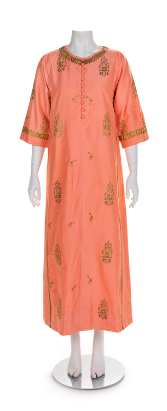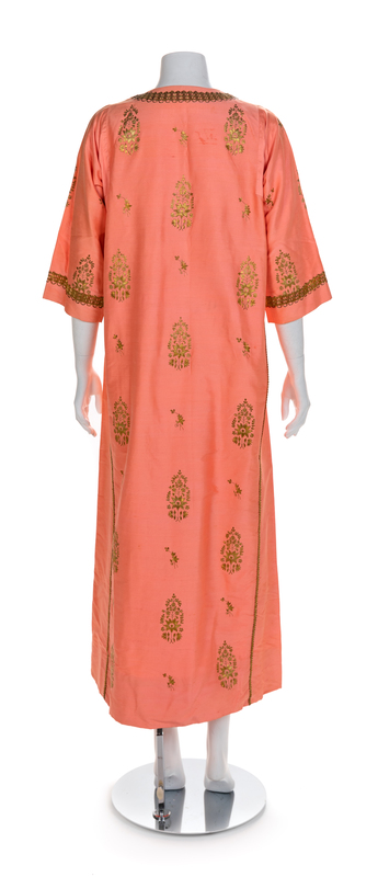 Embroidered pink dress is unlabeled. The purpled dress is by John Mandl.