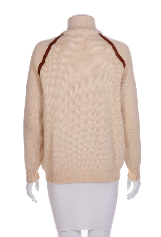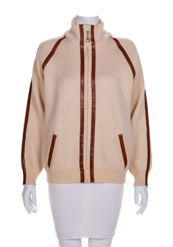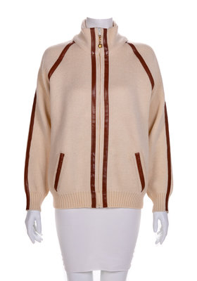 Cream wool knit trimmed with brown leather and cut with a stand collar, long sleeves and hip pockets. Closed down center front with a separating zip. Label: Celine