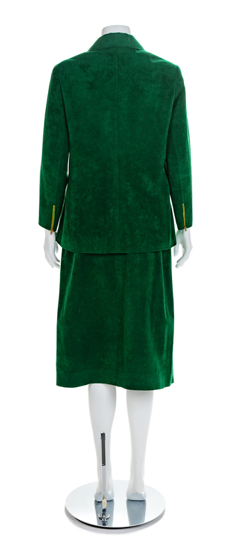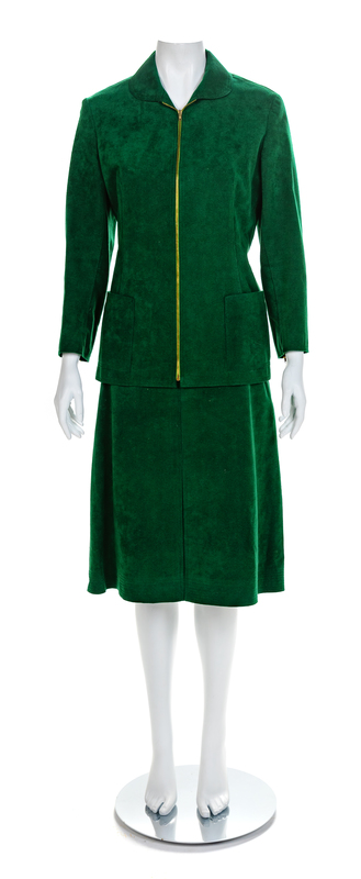 Green suede jacket and skirt. Jacket has a fold collar, long sleeves with a zipper hem, two front patch pockets and a center front zip. The straight skirt has a center front pleat up to the hip and closes with a zip. Label: Halston