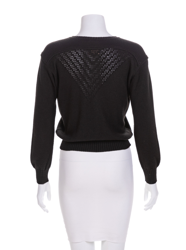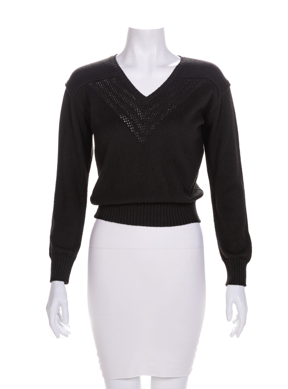 Black knit sweater with v-neck and long sleeves. Label: Courreges