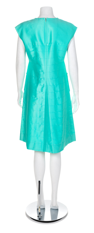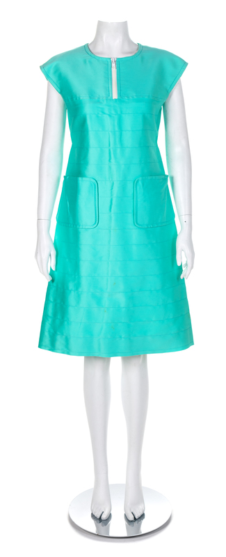 Sleeveless dress with crew neckline and center front neck zip, two patch pockets and a center back zip closure. Label: Courreges