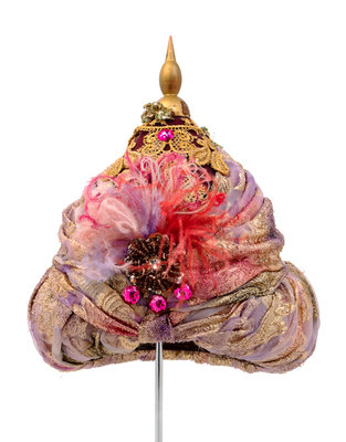 heavily padded throughout interior, metallic trim and fabric stripes and a partial back zip closure; together with a brown sequin embellished oversized collar with a tie closure. Hat; purple with goldtone lame. From Love of Three Oranges by Sergei Prokofiev. Label: Tirelli Costuma RomaHat: Unlabeled